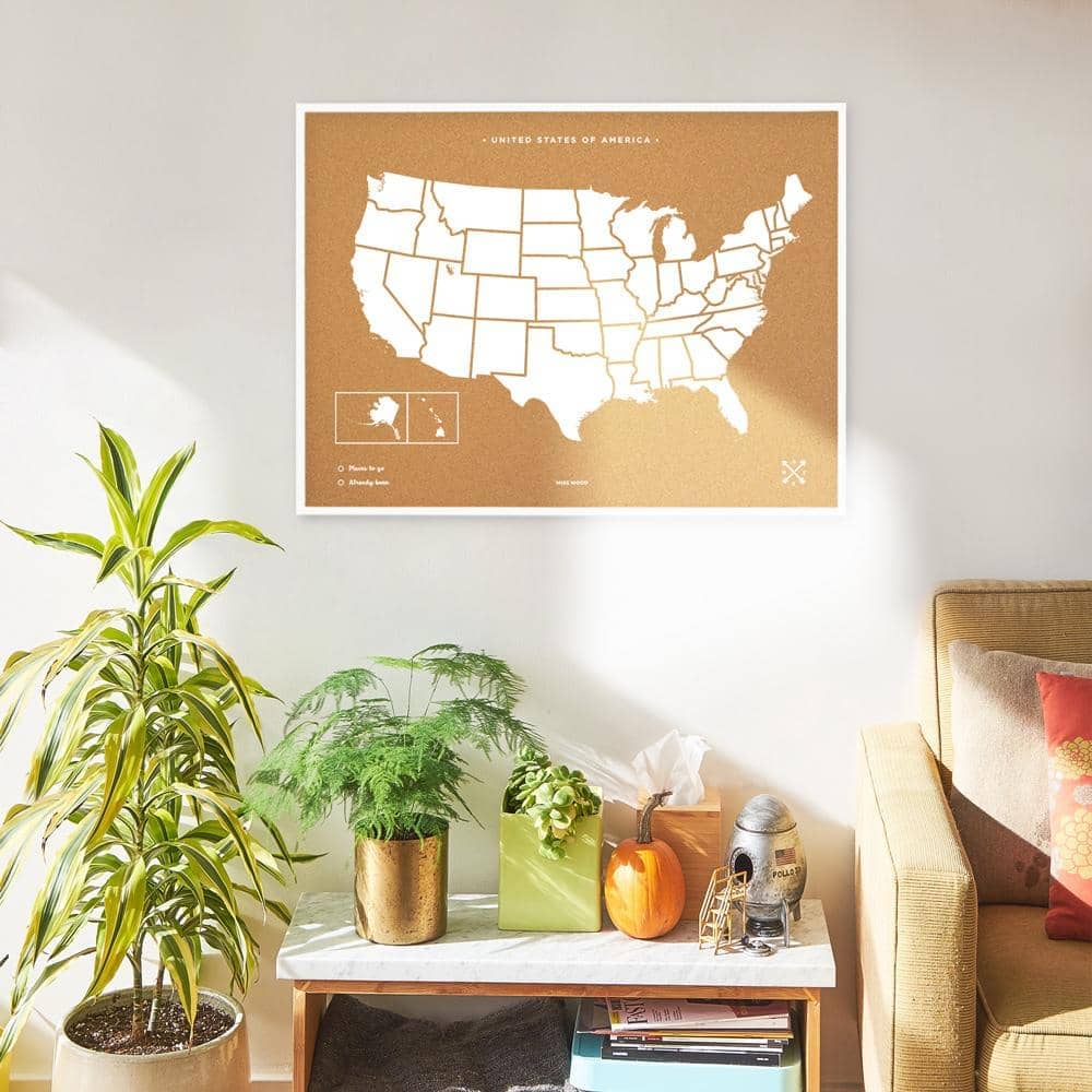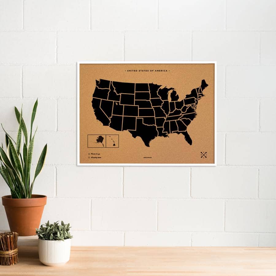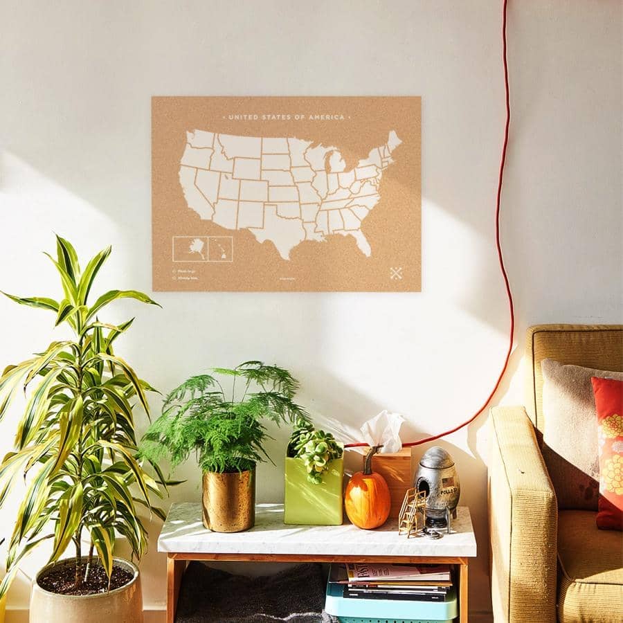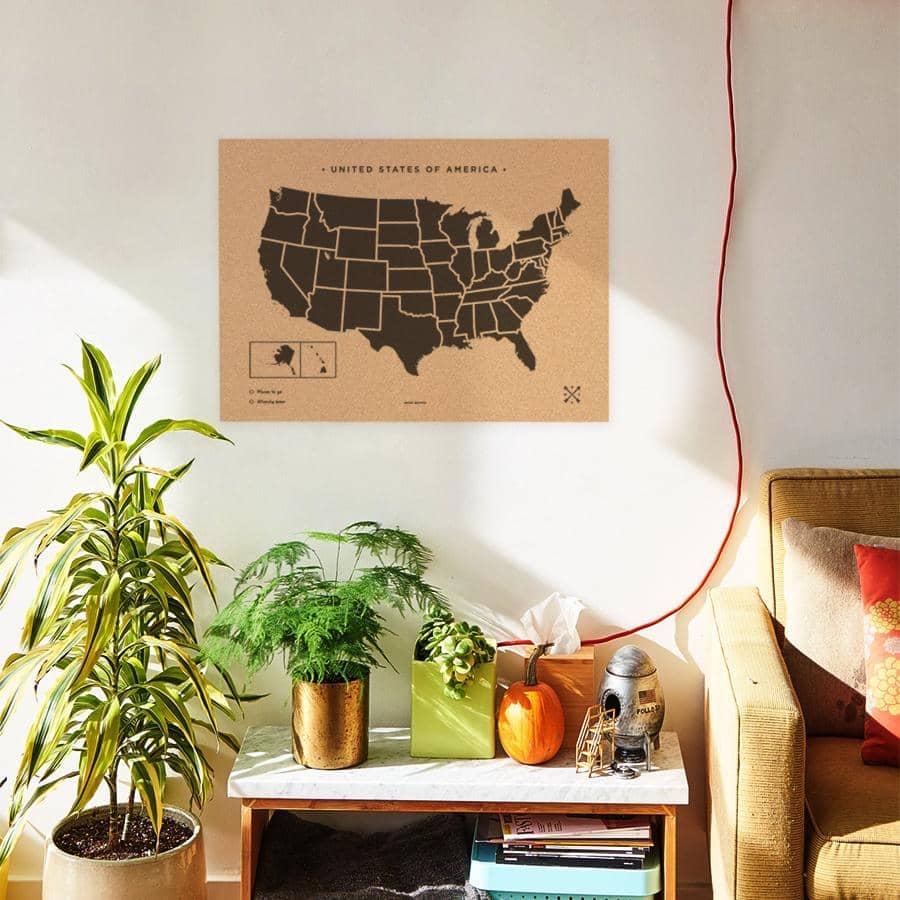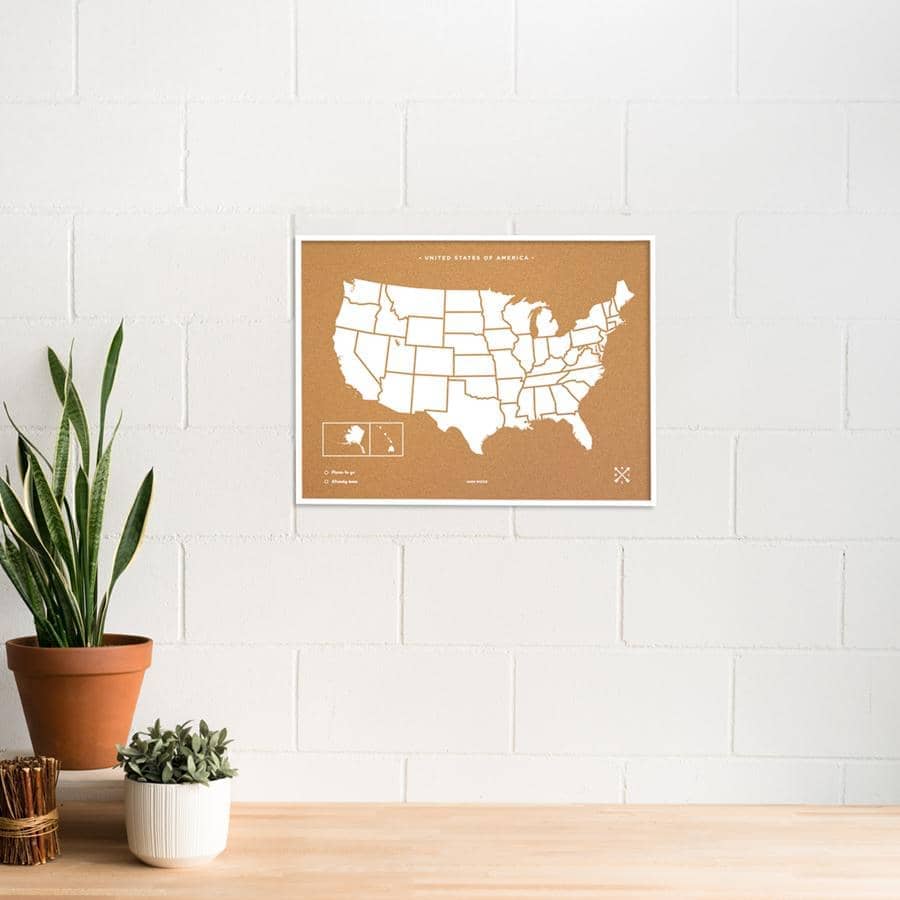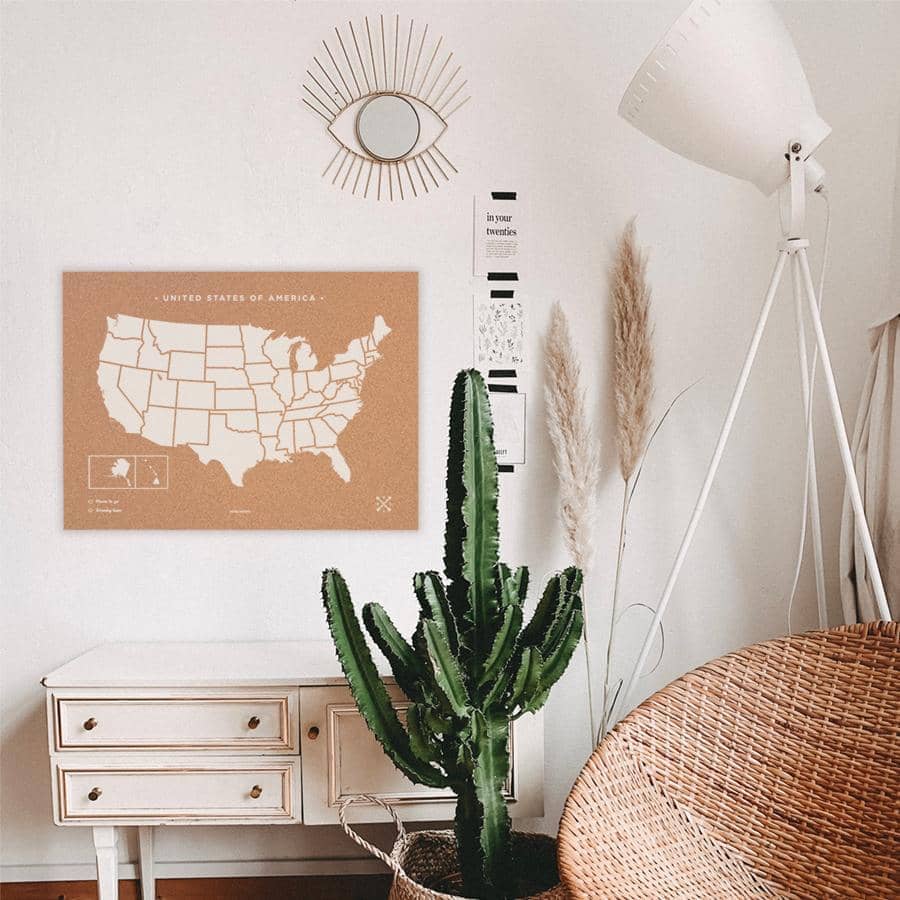 Decora las paredes de tu casa con un cuadro de Estados Unidos de corcho. Elige entre el color blanco o negro para el marco y el diseño y piensa un lugar de tu casa donde los vas a colgar. ¿Lo tienes? Ahora ya solo queda pinchar las chinchetas que vienen incluidas en el mapa y colgar tus fotos estilo vintage.