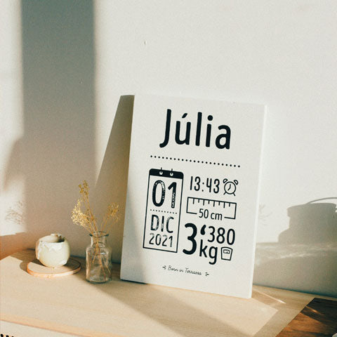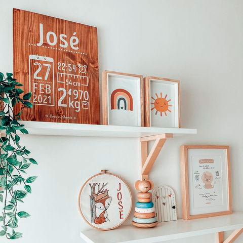 Un cuadro para el cuarto del bebé, de gran calidad y personalizado con sus datos de nacimiento. Un recuerdo del día más especial que decorará su habitación con un toque natural y artesanal. Una idea de regalo perfecta para un bautizo.