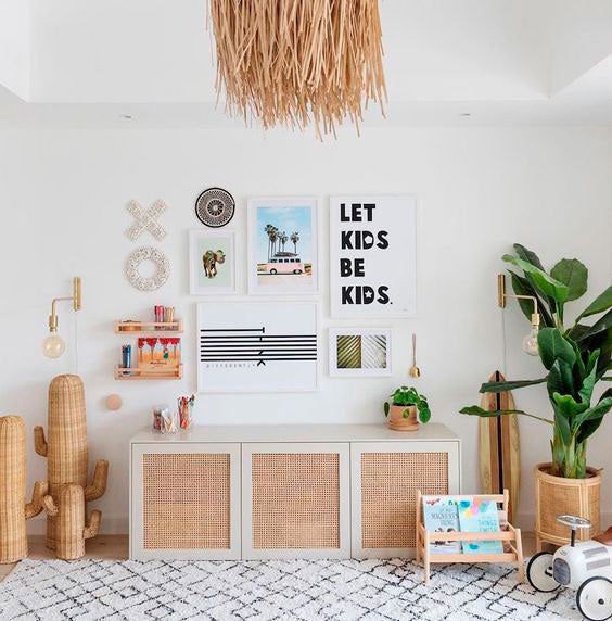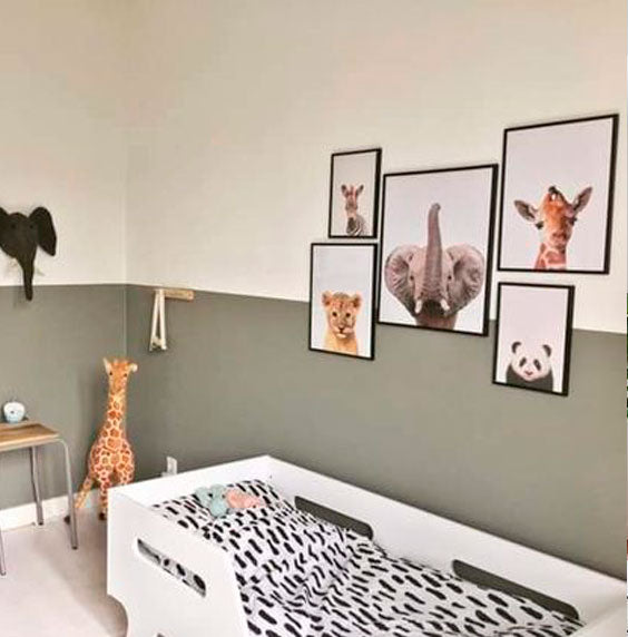 Las paredes de un dormitorio infantil han de expresan cómo es tu niño o niña. Coloca cuadros con sus animales favoritos, colores que les flipen o ilustraciones que les gusten. Déjale que sean ellos quien eligan las láminas para que se convierta en su lugar por excelencia de descanso y aventuras.