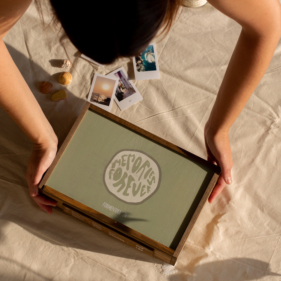 Une autre idée parfaite pour cette occasion est une boîte à souvenirs personnalisée, mieux accompagnée d'un pack de photos Rétro de vos meilleurs moments ensemble. C'est l'accessoire idéal pour conserver les souvenirs de chaque voyage.