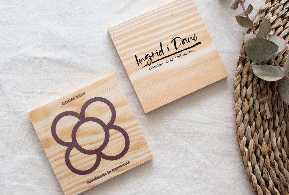 Un symbole qui identifie la ville de Barcelone comme souvenir à offrir à vos invités. Avec vos noms sérigraphiés sur l'autre face. Un cadeau de mariage unique et écolo. Évidemment, fait à la main.
