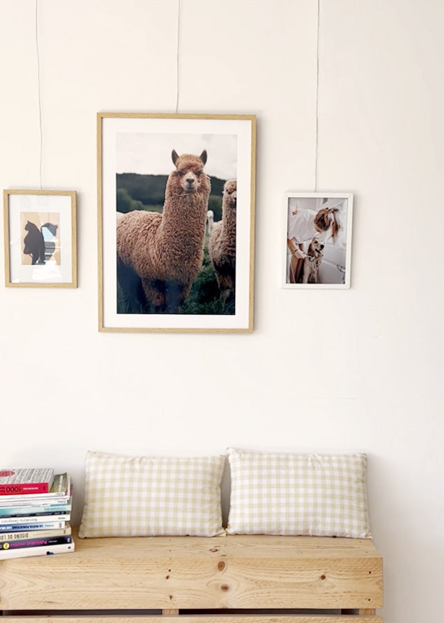 4. Pega los colgadores adhesivos en la pared y coloca tus cuadros.