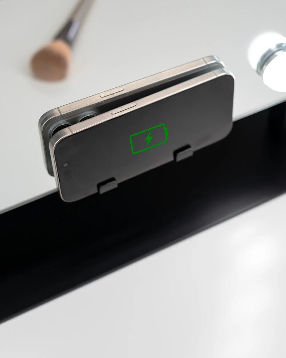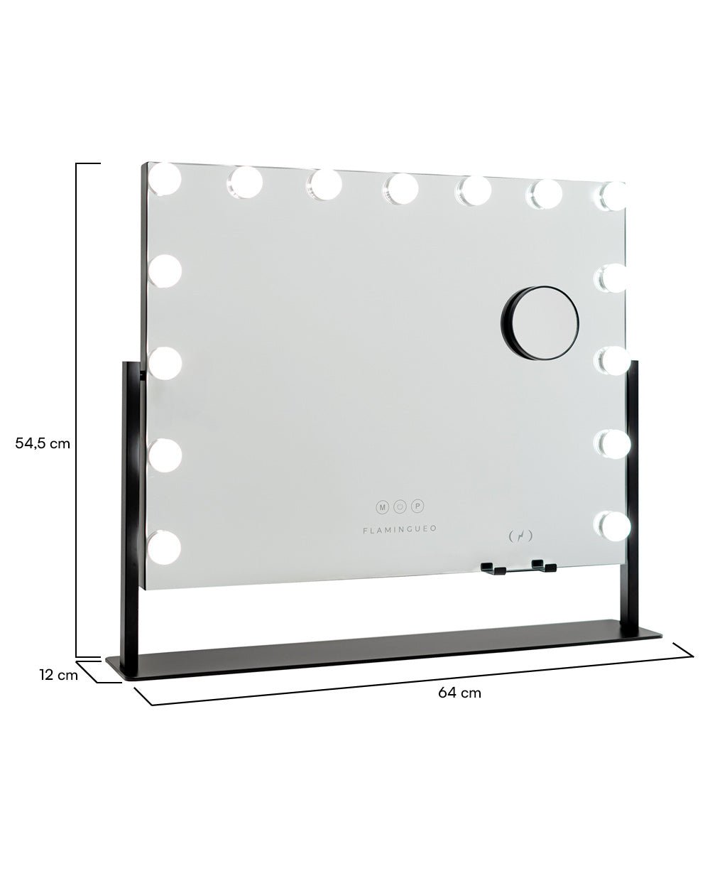 Espejo blanco reclinable con 15 luces LED, perfecto para maquillarte o disfrutar de tus rutinas de cuidado personal.