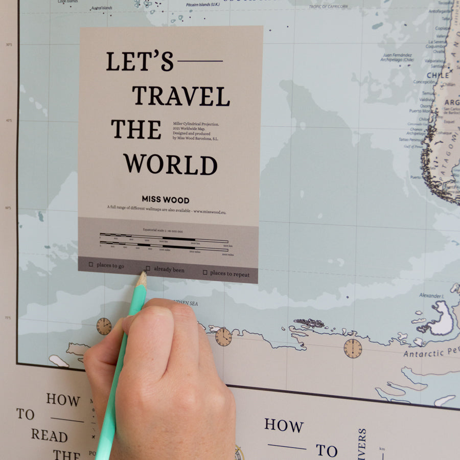 “Let 's travel the world”, así es el título de este poster mapamundi de pared. Junto a él encontrarás 3 casillas en las que *colorear con rotu o con pegatinas de colores ( *no incluidos en el mapa) los lugares visitados (color verde), los que quieres visitar (color rojo) y los que te encantaría repetir (color azul).
